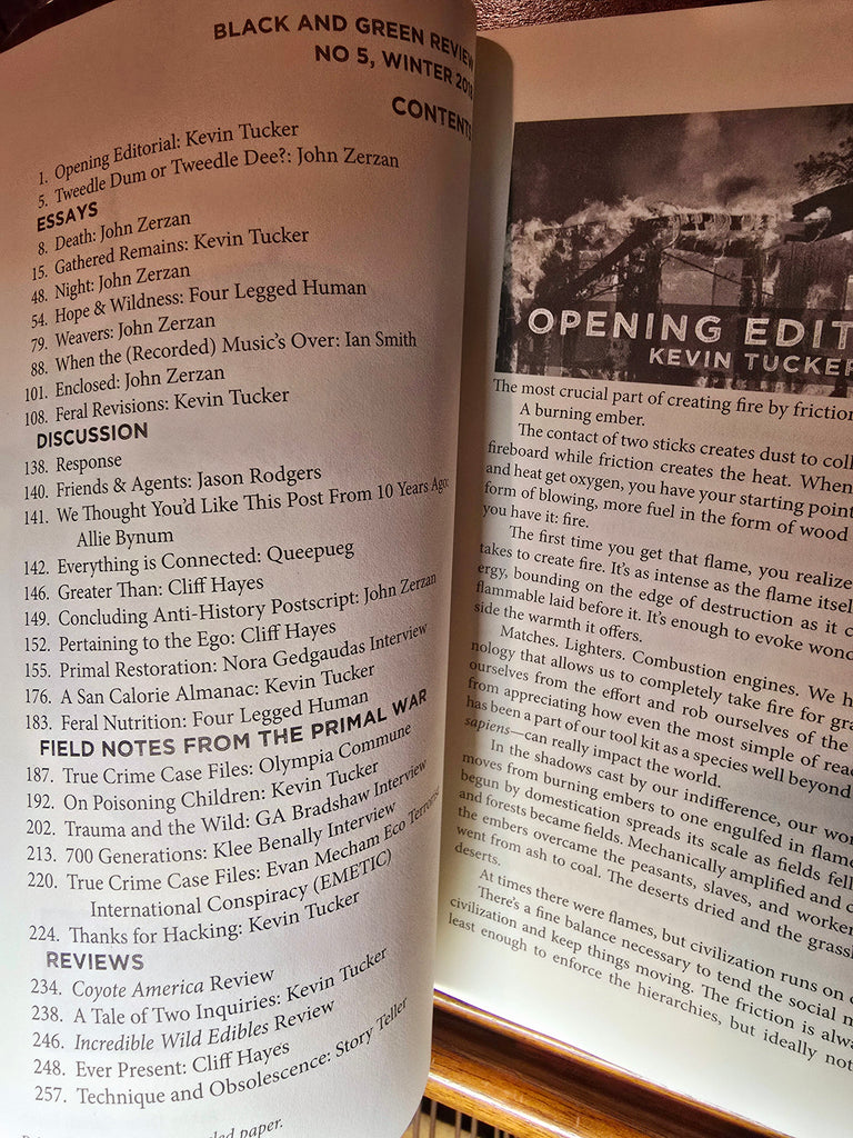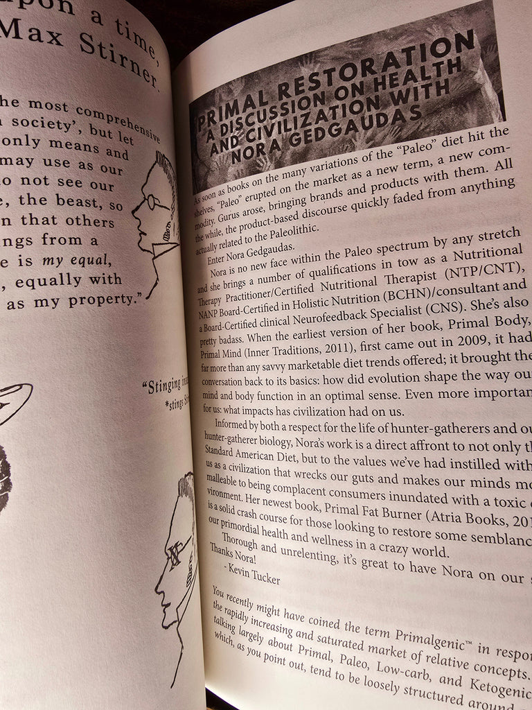 280 pages of anti-civilization critique, praxis and discussion. Essays from John Zerzan, Kevin Tucker, Four Legged Human and Ian Smith. Some really great interviews with truly amazing people; Gay Bradshaw (Carnivore Minds), Klee Benally (Indigenous Action), and Nora Gedgaudas (Primal Body, Primal Mind). In depth looks at the resisting the Canyon Mine & nuclear colonialism, the Olympia Commune, Evan Mecham Eco Terrorist International Conspiracy (EMETIC), PTSD in wild populations, an increasingly hackable modernity, the return of the Old Ways in Native populations, rewilding, resistance, and a lot of digging at the roots of the mess we are in. Plus some extremely in depth reviews and a lot more.