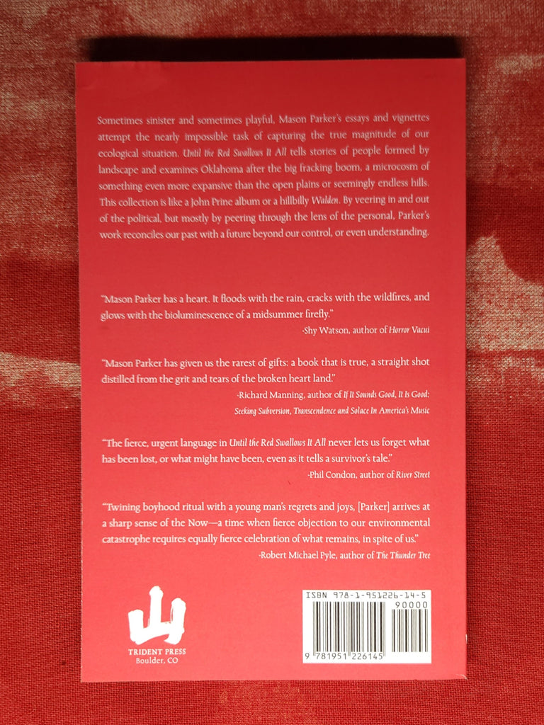 Sometimes sinister and sometimes playful, Mason Parker’s essays and vignettes attempt the nearly impossible task of capturing the true magnitude of our ecological situation. Until the Red Swallows It All tells stories of people formed by landscape and examines Oklahoma after the big fracking boom, a microcosm of something even more expansive than the open plains or seemingly endless hills. This collection is like a John Prine album or a hillbilly Walden. By veering in and out of the political, but mostly by peering through the lens of the personal, Parker’s work reconciles our past with a future beyond our control, or even understanding.