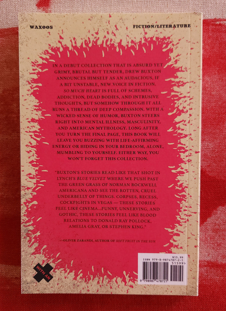 In a debut collection that is absurd yet grimy, brutal but tender, Drew Buxton announces himself as an audacious, if a bit unstable, new voice in fiction. So Much Heart is full of schemes, addiction, dead bodies, and intrusive thoughts, but somehow through it all runs a thread of deep compassion, with a wicked sense of humor, Buxton steers right into mental illness, masculinity, and American mythology. Long after you turn the final page, this book will leave you buzzing with life-affirming energy or hiding in your bedroom, alone, mumbling to yourself. Either way, you won't forget this collection.