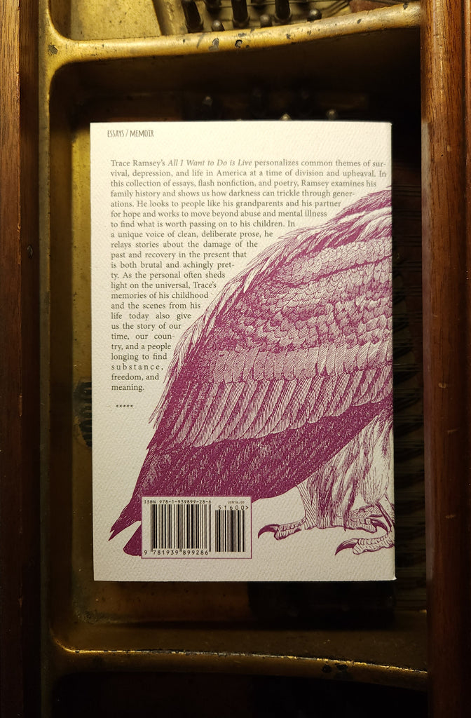 Trace Ramsey’s All I Want to Do is Live personalizes common themes of survival, depression, and life in America at a time of division and upheaval. In this collection of short stories, essays, and poetry, Ramsey examines his family history and shows us how darkness can trickle through generations. He looks to people like his grandparents and his partner for hope and works to move beyond abuse and mental illness to find what is worth passing on to his children. In a unique voice of clean, deliberate prose, he relays stories about the damage of the past and recovery in the present that is both brutal and achingly pretty. As the personal often sheds light on the universal, Trace's memories of his childhood and the scenes from his life today also give us the story of our time, our country, and a people longing to find substance, freedom, and meaning.
