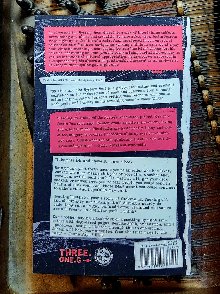 GG Alien and the Mystery Meat dives into a slew of intertwining subjects surrounding art, class, and sexuality, to name a few. Here, Justin Pearson steps right up to the line of a social faux pas steeped in current social politics as he reflects on navigating working a minimum wage job at a gay club while maintaining a non-paying job as a "musician" throughout his thirties. Addressing an ever-present overwhelming capitalistic economy as well as his potential cultural appropriation, he lays out (or maybe coughs and spreads out) his absurd and questionable time spent as an employee at San Diego's most popular gay night club.
